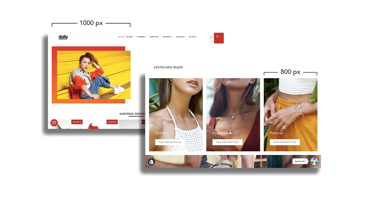 Anchura en píxeles: En la mayoría de los casos, de 1000 a 2500 px. Y cuidar la orientación si todas se necesitan en cuadrado, horizontal o vertical asi deben ir, por ejemplo en un slider todas deben tener el mismo ancho y alto